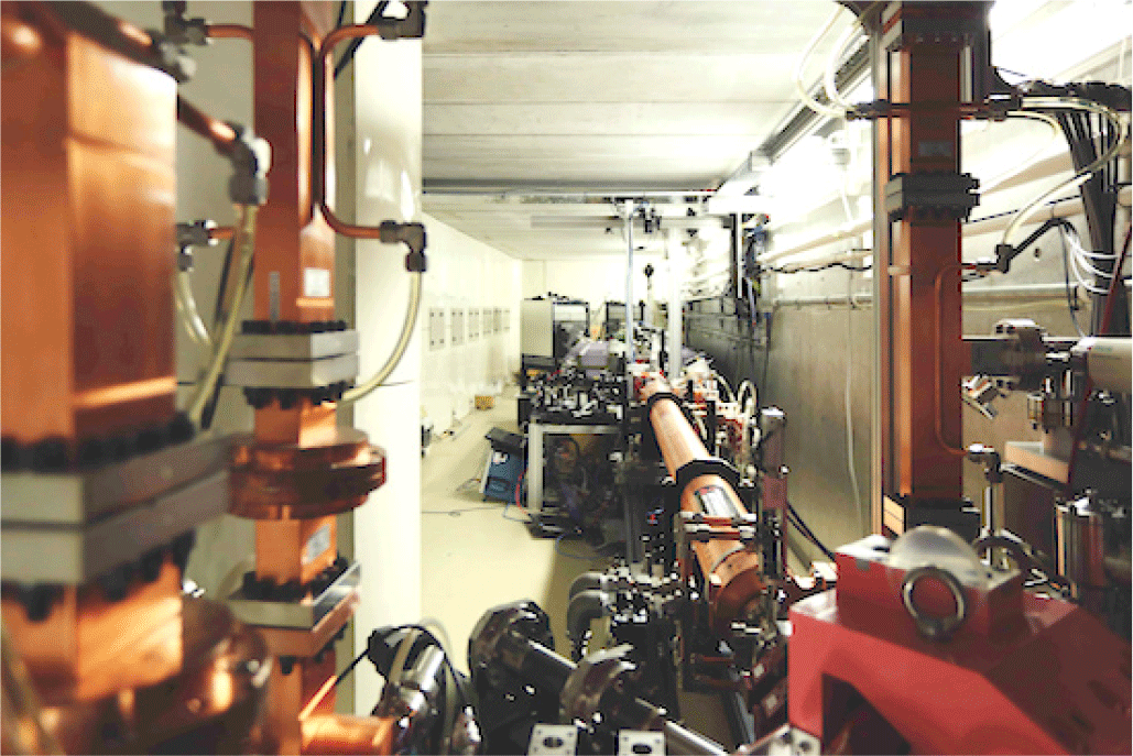 Coherent radiation, electromagnetic radiation in which waves have a constant phase relationship, emitted from an electron beam was firstly observed at LNS, former ELPH, in 1989 [11]. Since wavelengths sufficiently shorter than electron bunches are mostly coherent, intensity is proportional to the square of number of electrons. At ELPH, very-short electron beam pulses are available at the t-ACTs facility (test accelerator as coherent terahertz source). t-ACTs consists of an original thermionic radiofrequency (RF) electron gun followed by a 3-m-long accelerating structure and produces an electron bunch length of 80 femtosecond (~25μm) employing a velocity bunching scheme in the accelerator structure [12]. Since the energy range is from 20 to 50 MeV, intense coherent radiation in the terahertz region is able to be produced. At the moment, coherent transition radiation up to 4 THz can be provided for experiments. In addition, a crossed-undulator system is also under development as a variable polarized terahertz source to be used for circular dichroism spectroscopy [13]. As for accelerator science, novel beam diagnostic tools employing coherent radiation such as Cherenkov and Smith-Purcell effects are being developed [14].